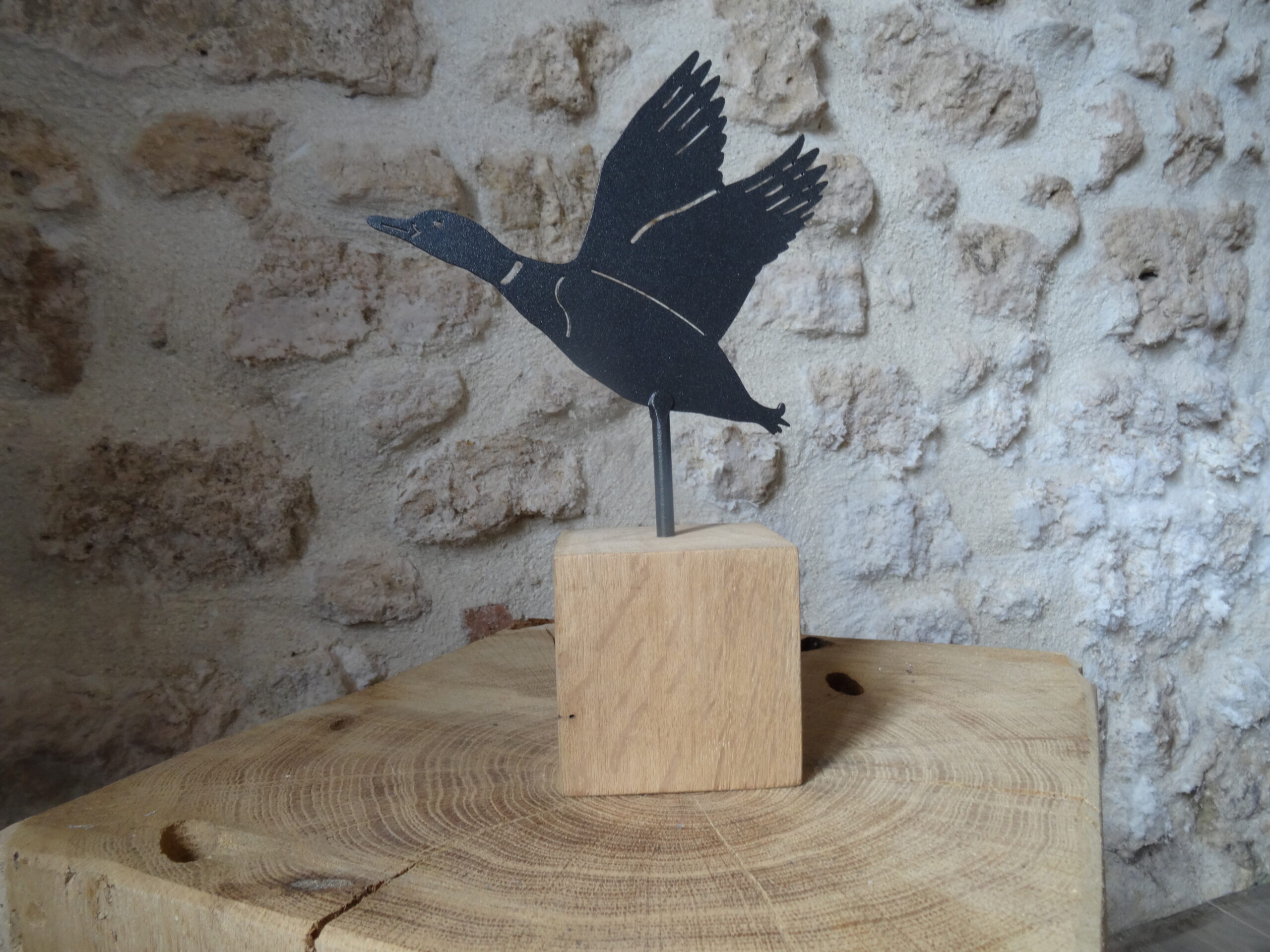 Canard colvert en acier 2mm sur socle en bois massif brut, dessiné à la main. Cette décoration d’intérieur trouvera facilement sa place dans votre maison, sur une étagère, un meuble, une table…le socle en bois massif peux avoir des couleurs, nuances et cernes d’aspects variables selon le bois utilisé.