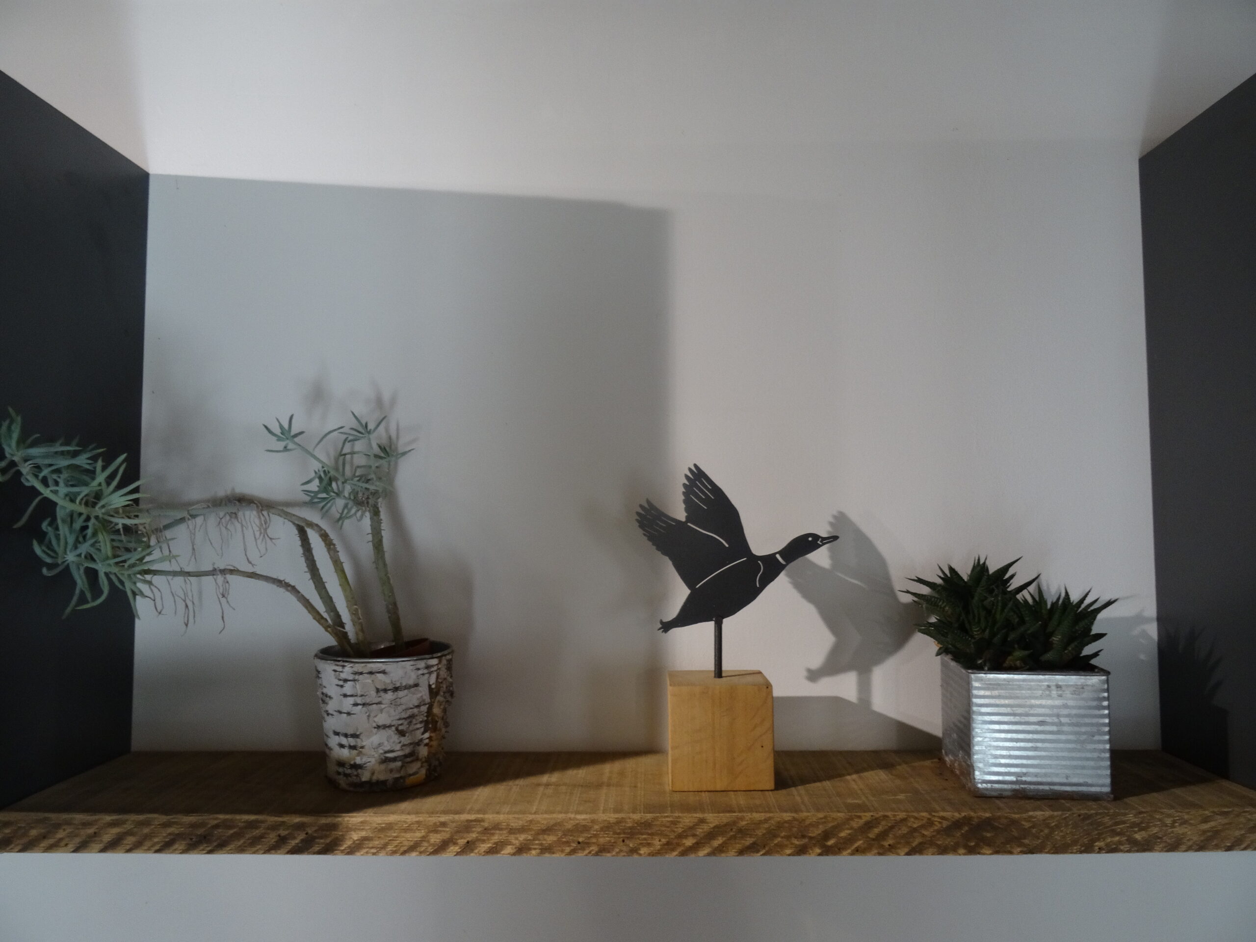 Canard colvert en acier 2mm sur socle en bois massif brut, dessiné à la main. Cette décoration d’intérieur trouvera facilement sa place dans votre maison, sur une étagère, un meuble, une table…le socle en bois massif peux avoir des couleurs, nuances et cernes d’aspects variables selon le bois utilisé. couleur gris anthracite Artisanat français. essence […]