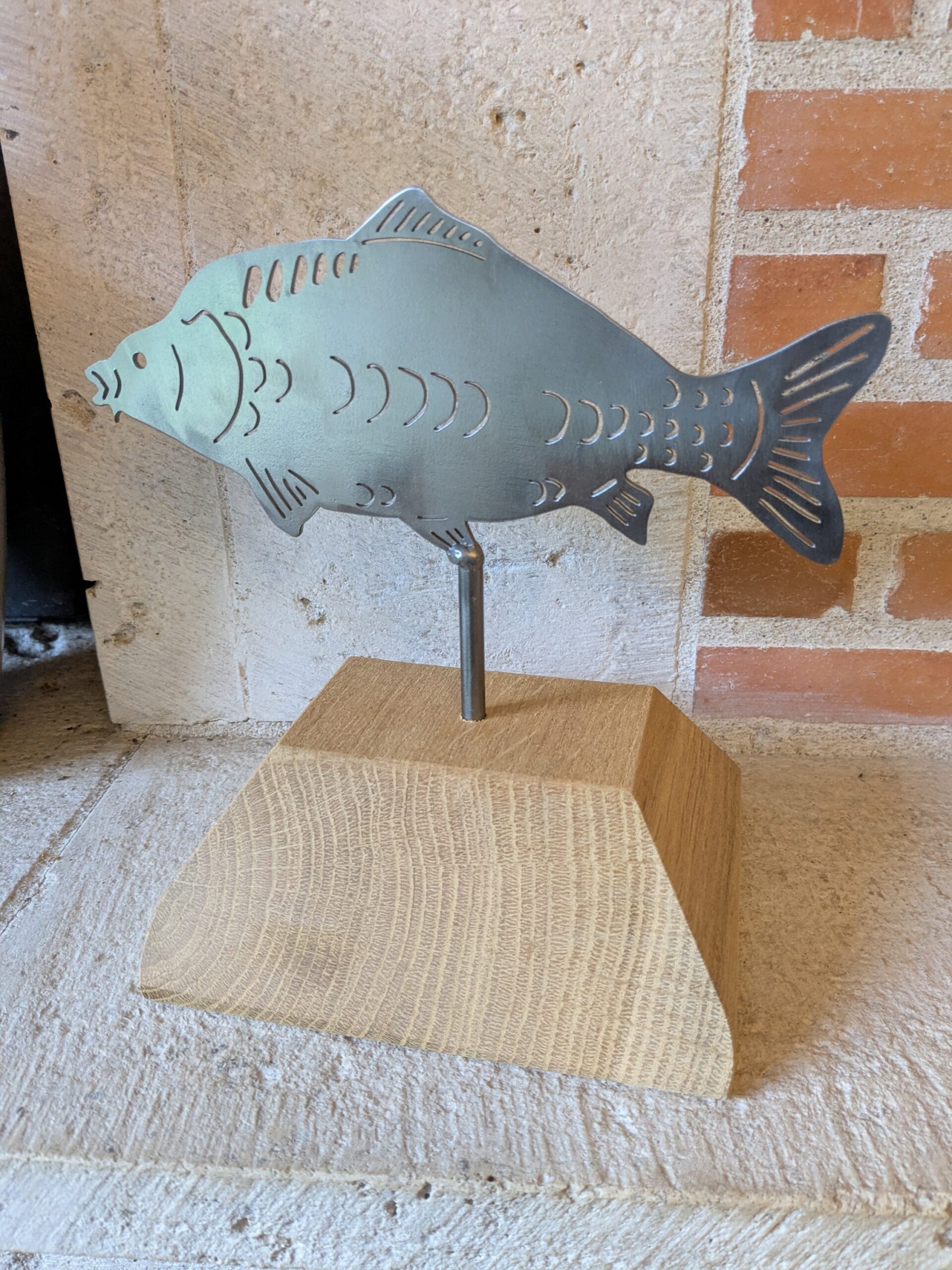 Carpe en acier 2mm brossé et vernis sur socle bois massif origine Sologne. Hauteur environ 18 cm Longueur environ 20 cm
