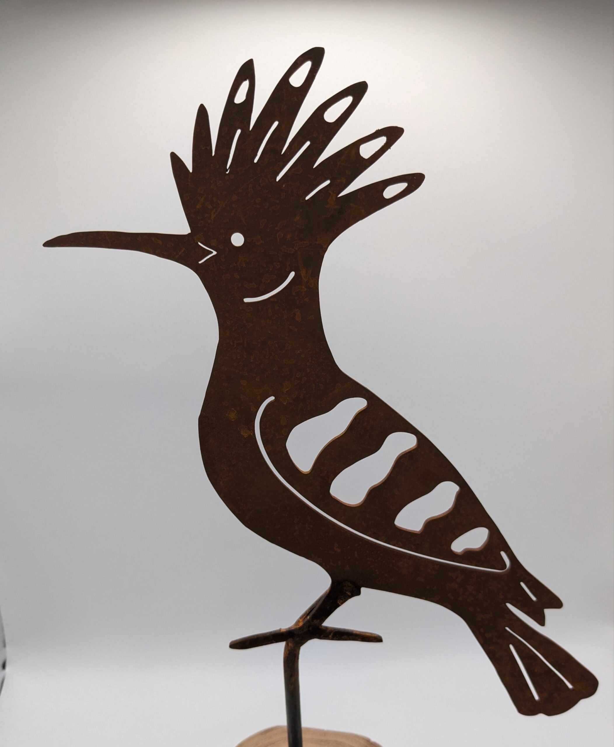 Huppe fasciée en acier rouillé épaisseur 2mm prête à planter au jardin, dans un pot de fleur, sur un poteau, une souche etc. La patine de la rouille évolue au fil du temps passé en extérieur. Objet qui ne craint pas le gel et la pluie. Ne pas installer sur un support qui craint les traces de rouille (dalle, terrasse…) ou au préalable lui appliquer un vernis métal pour stabiliser la rouille. Objet uniquement décoratif, ne pas laisser à la portée des enfants.