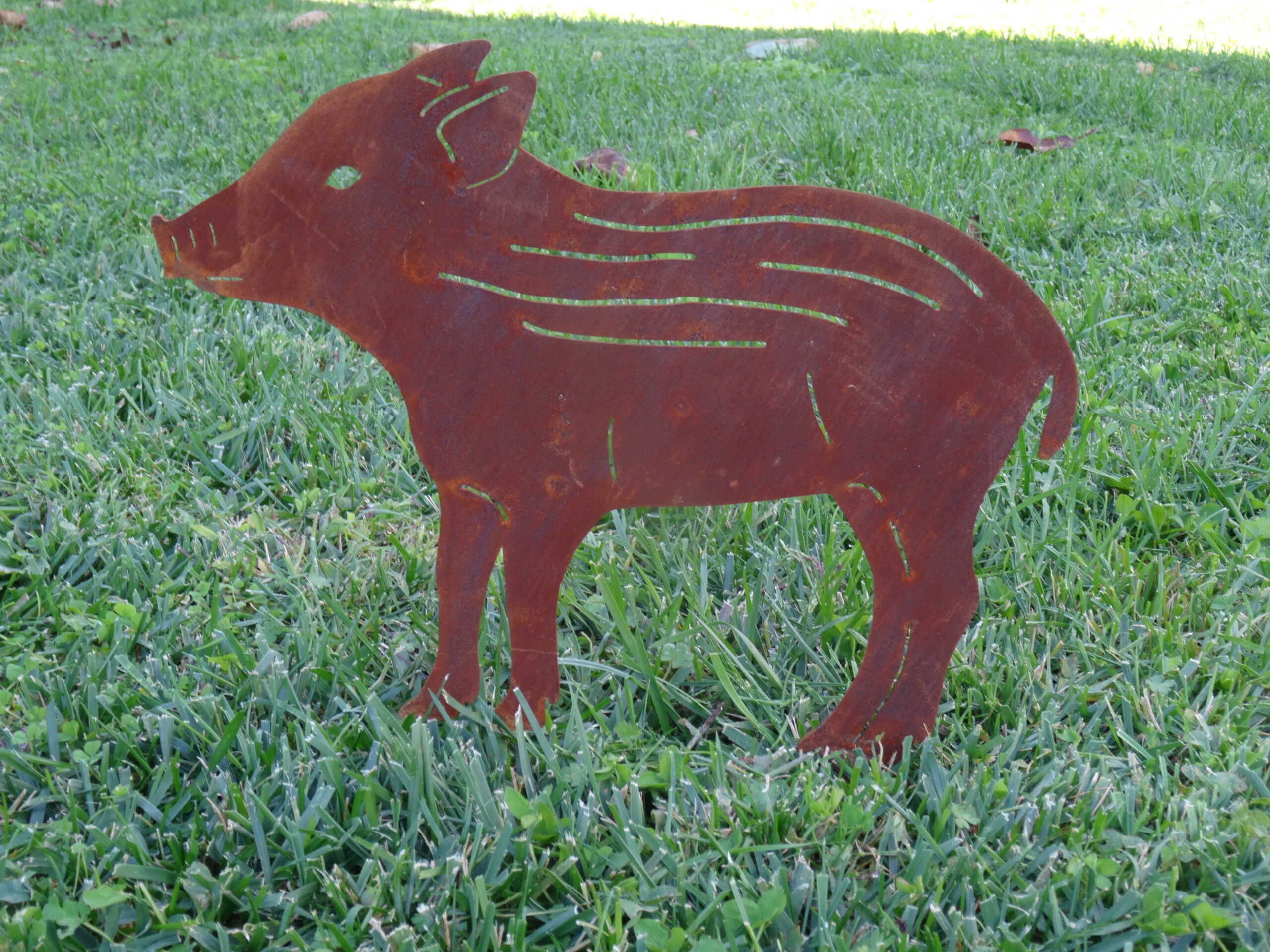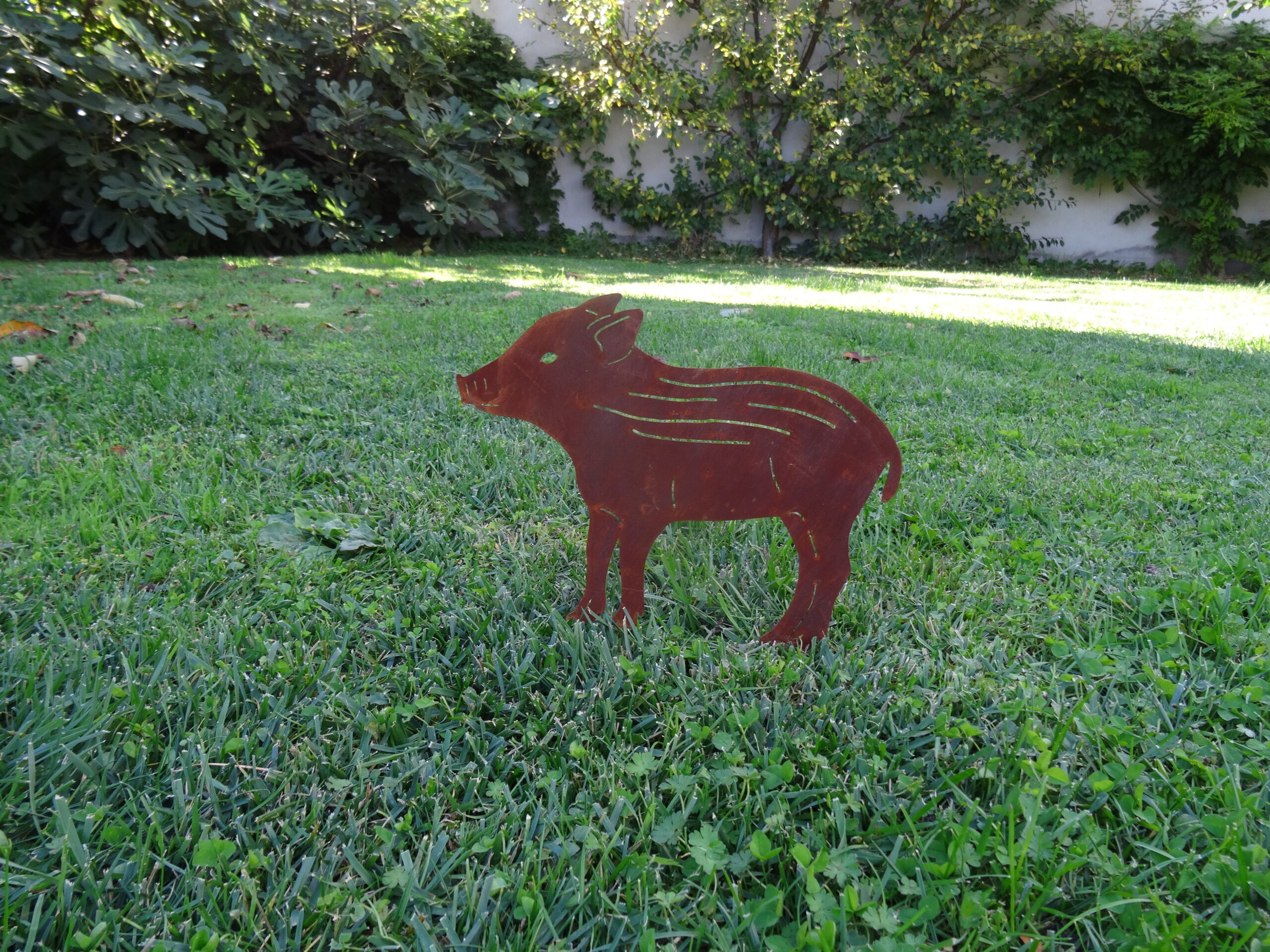 Marcassin tête en l’air en acier rouillé 2mm. Cette décoration de jardin est prête à planter grâce a sa tige fer à béton soudée. Elle ne nécessite aucun entretien particulier et continuera de s’oxyder au fil du temps et des intempéries; vous pouvez cependant si vous le souhaitez lui appliquer un vernis métal pour stopper la rouille et la corrosion. Cet objet est uniquement décoratif, ne pas laisser à la portée des enfants.