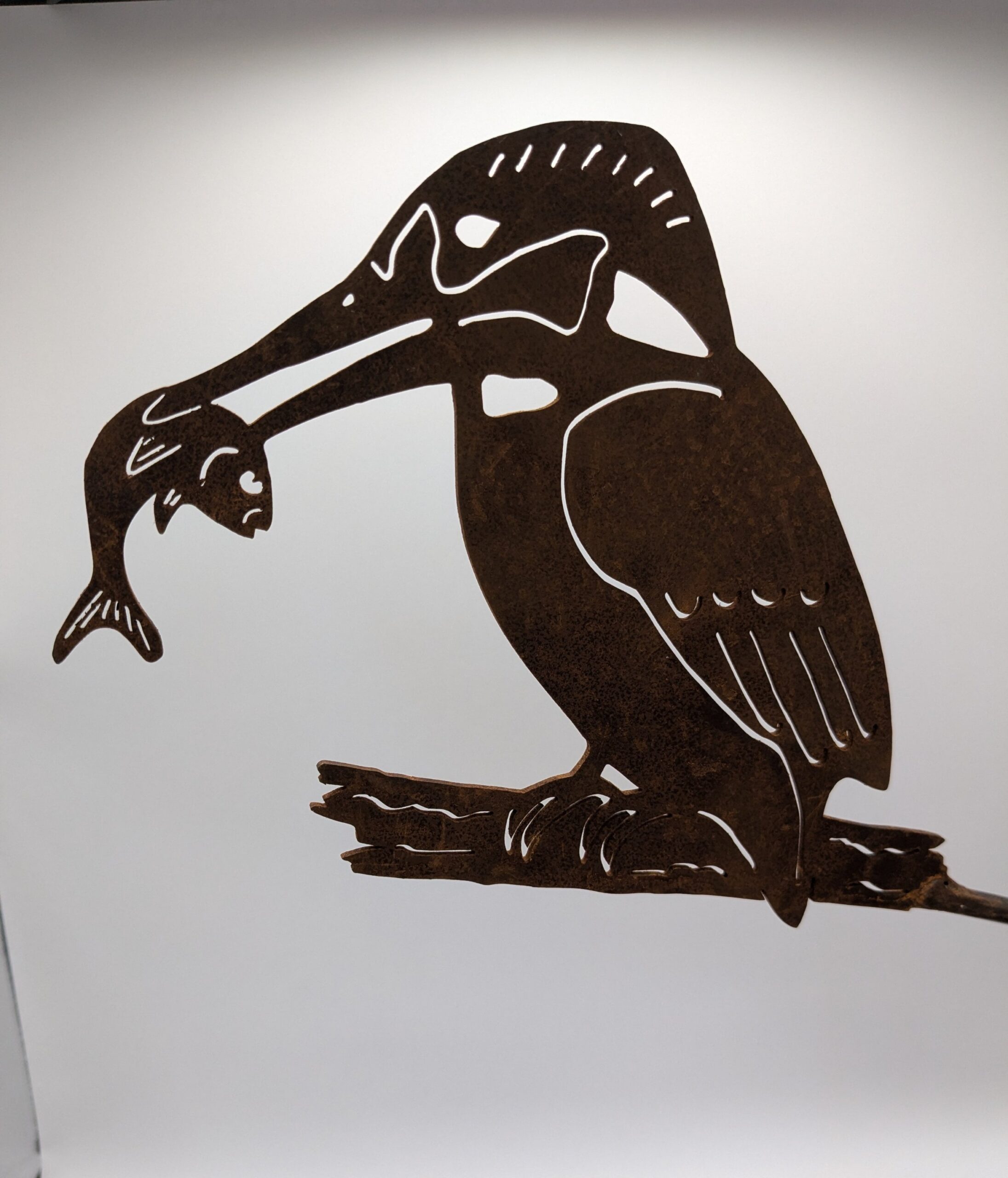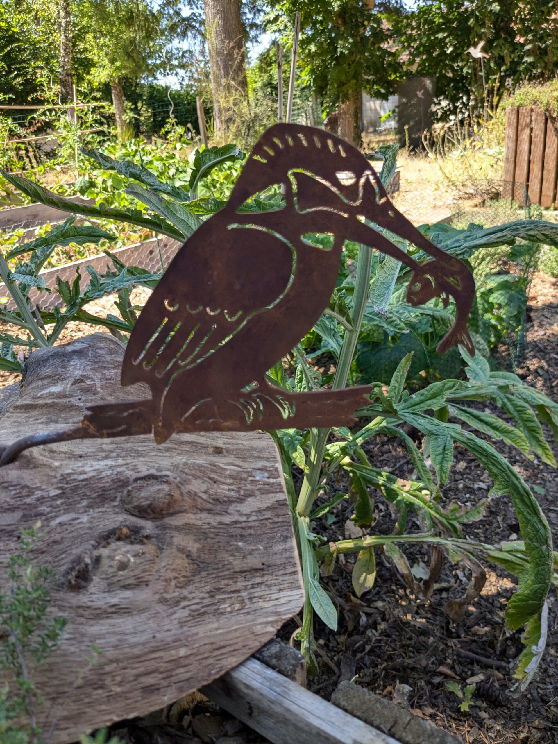 Martin pêcheur en acier rouillé 2 mm prêt à planter au jardin grâce à sa tige en acier. Cette décoration peut rester dehors tout au long de l’année sans entretien particulier (ne craint pas le gel, la pluie, la chaleur). Vous pouvez cependant y appliquer un vernis spécial métal pour stopper la rouille et la corrosion. Veillez à ne pas l’installer sur un support qui craint la rouille (terrasse, dalle, muret…). Objet uniquement décoratif, Laisser hors de portée des enfants.
