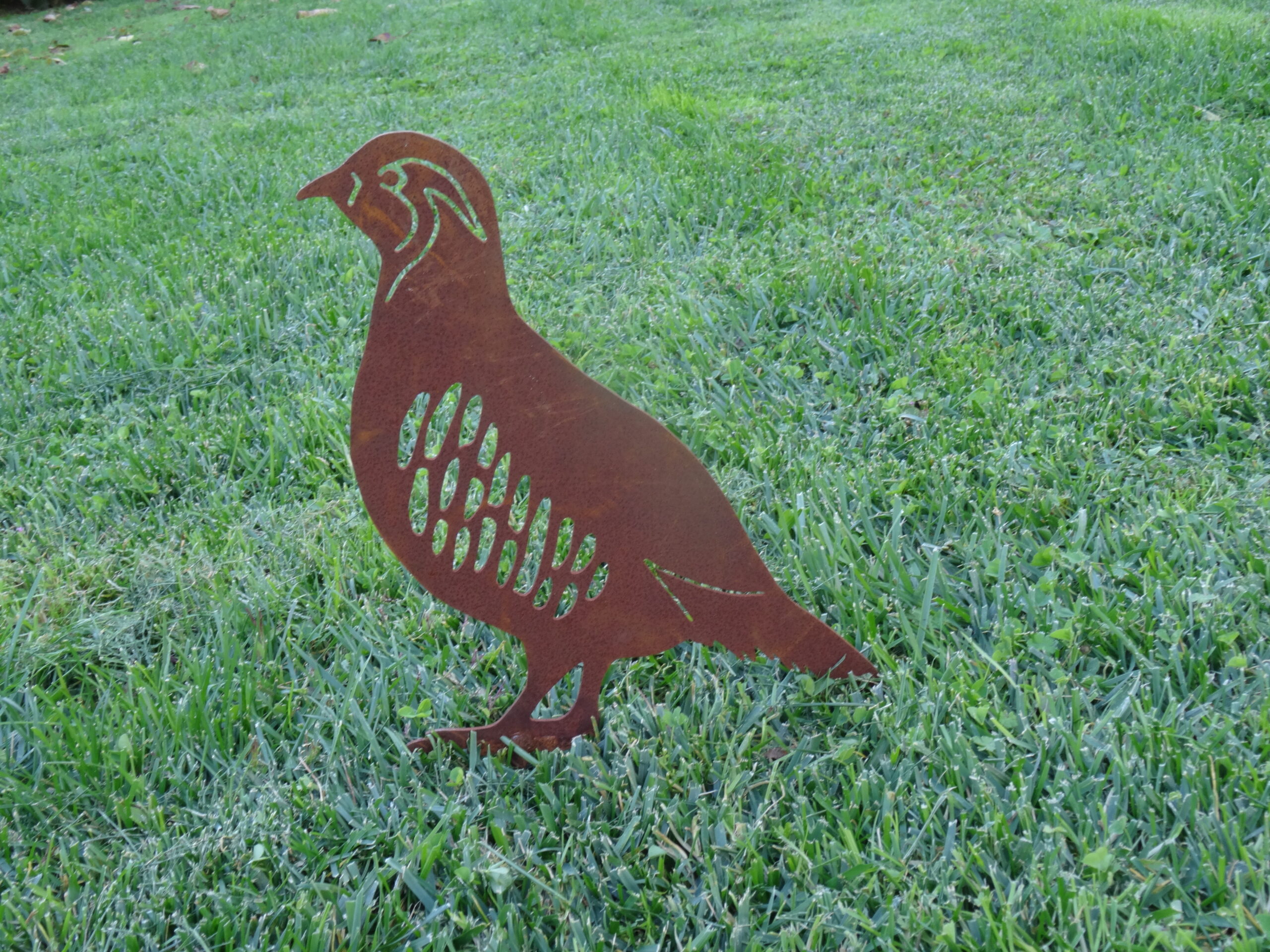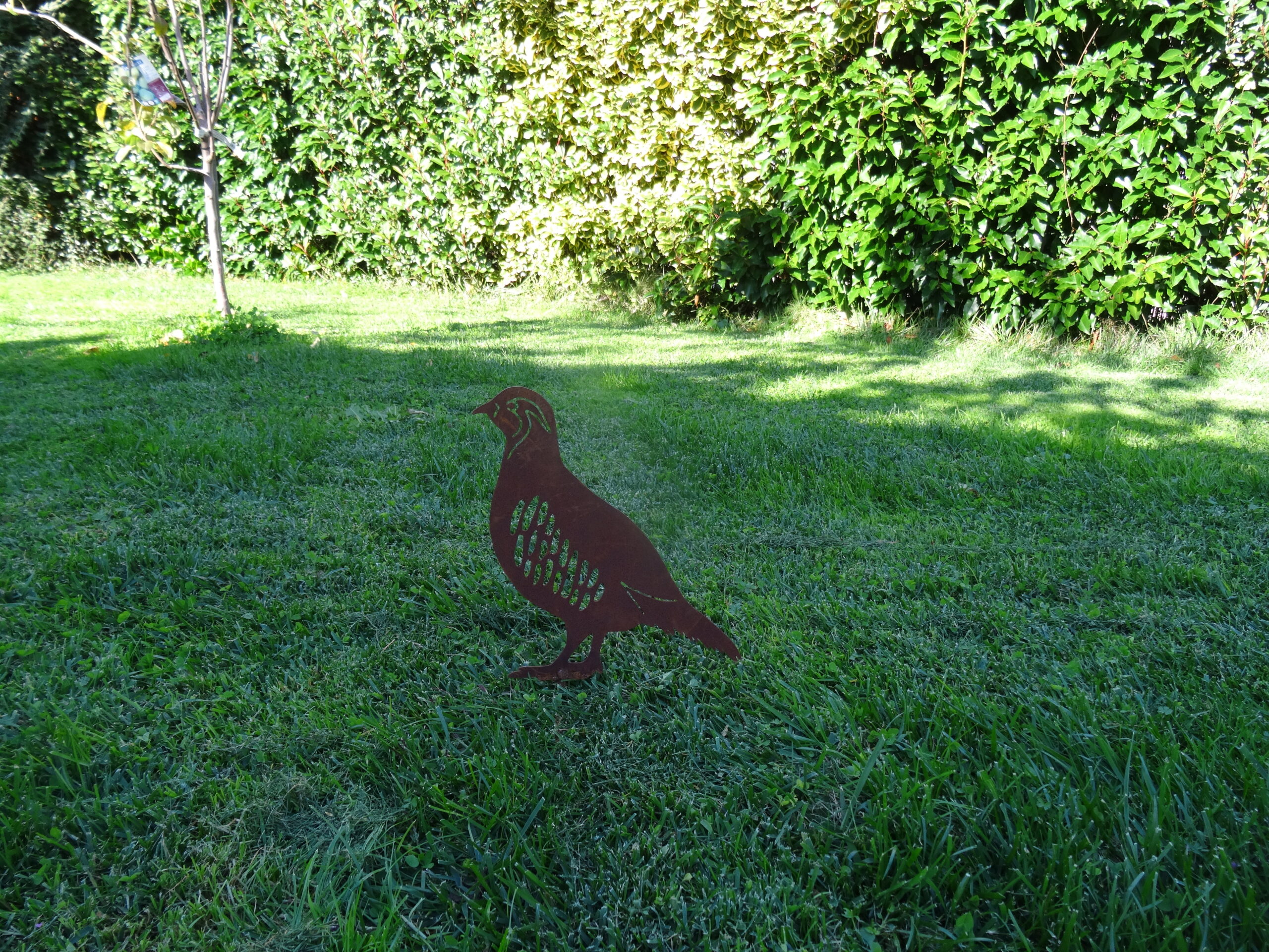 Perdrix taille réelle en acier rouillé 2mm. Cette décoration de jardin est prête à planter grâce a sa tige fer à béton soudée. Elle ne nécessite aucun entretien particulier et continuera de s’oxyder au fil du temps et des intempéries; vous pouvez cependant si vous le souhaitez lui appliquer un vernis métal pour stopper la rouille et la corrosion. Cet objet est uniquement décoratif, ne pas laisser à la portée des enfants.
