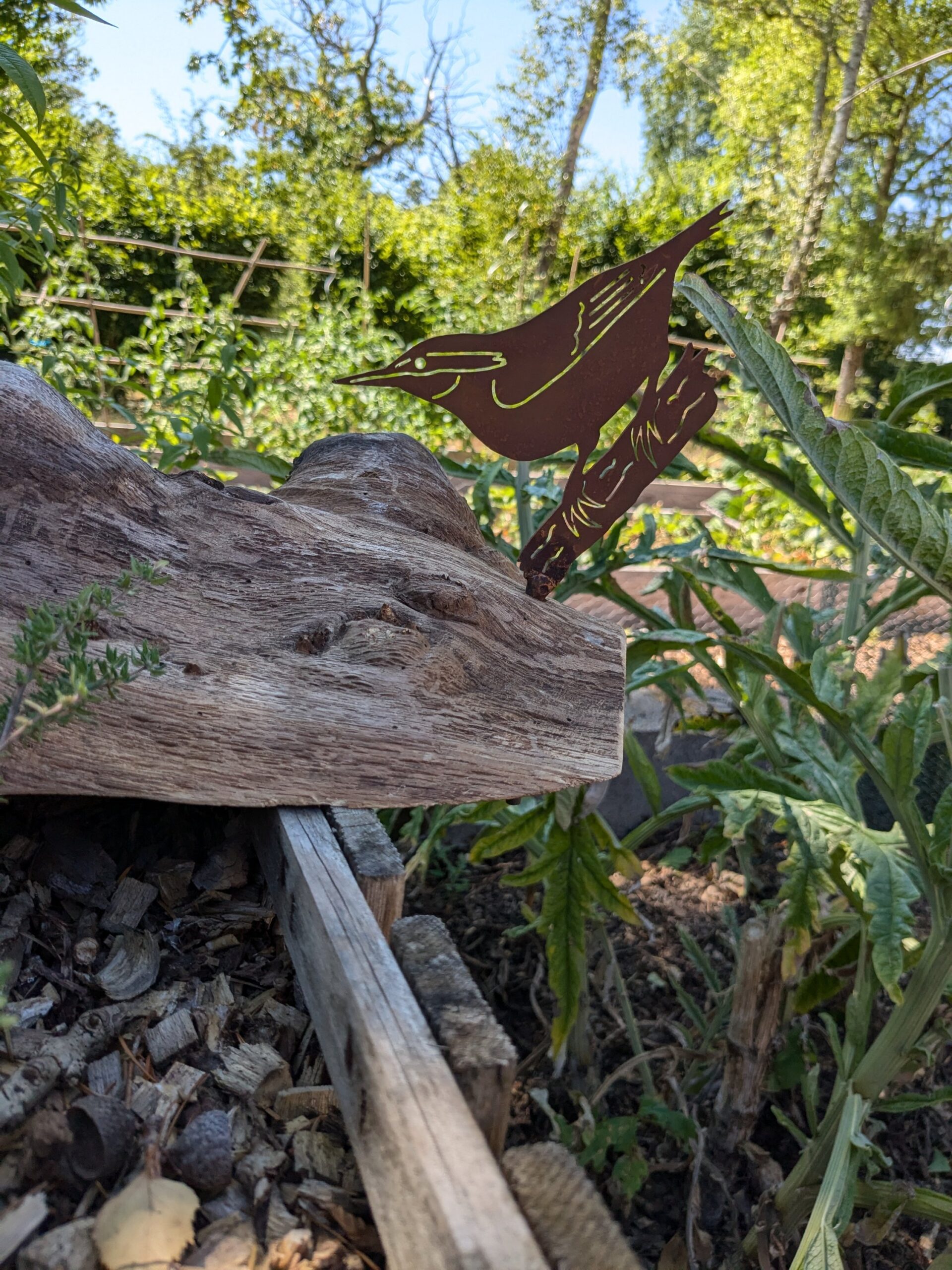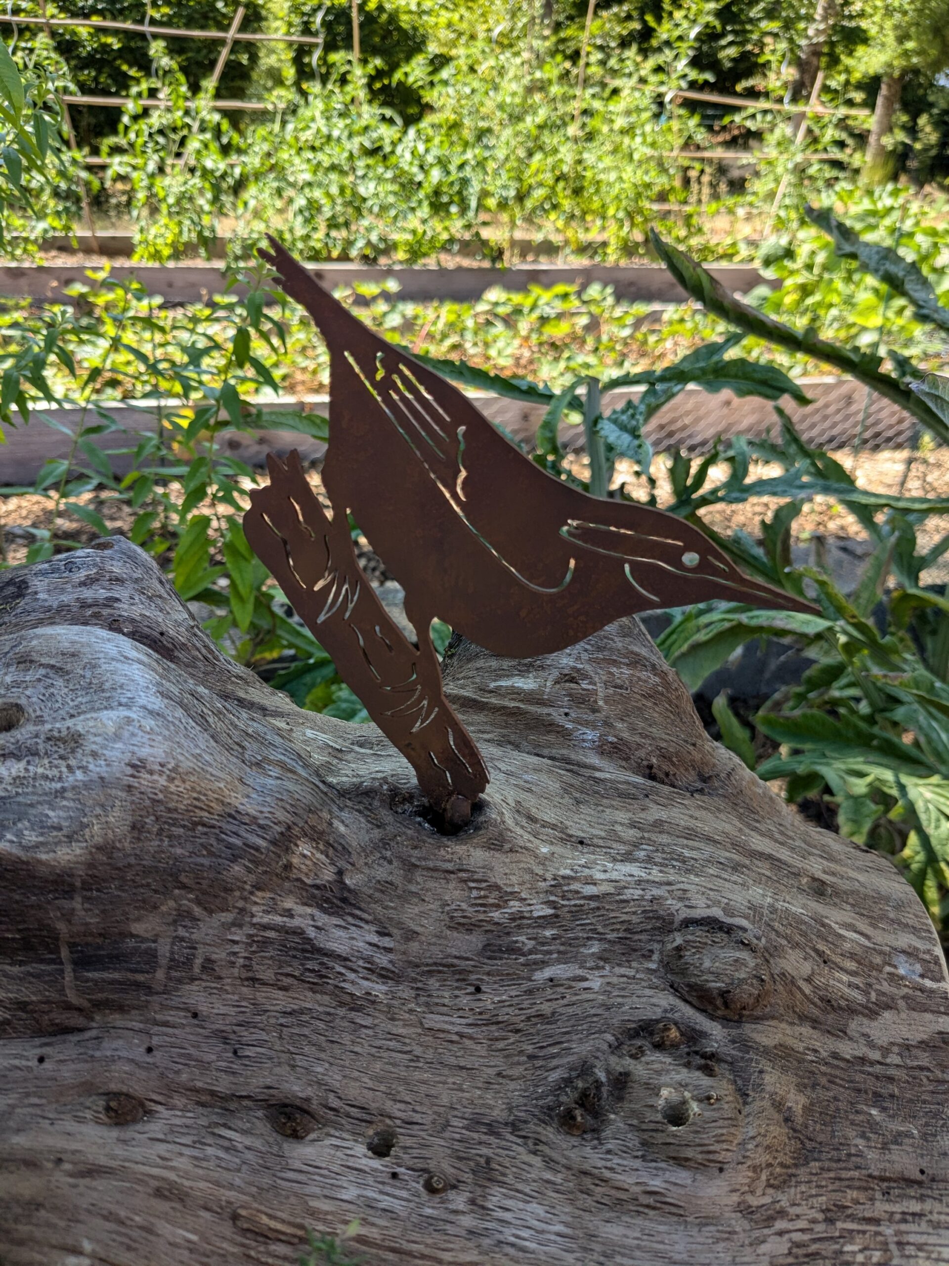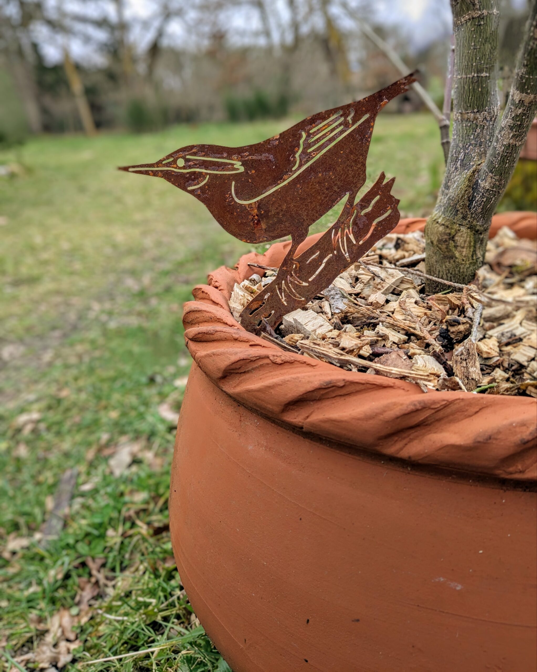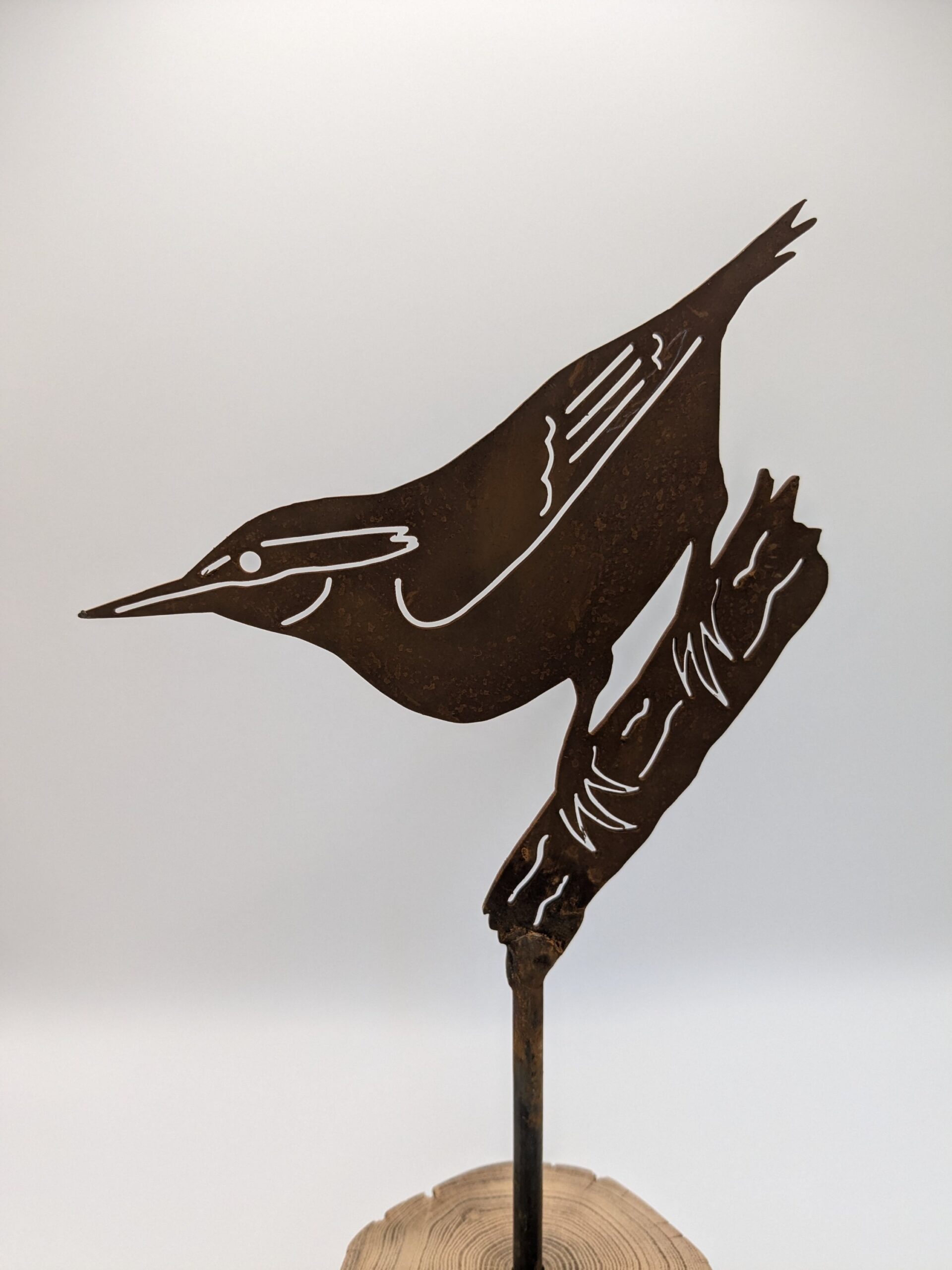 Sitelle en acier rouillé 2 mm prête à planter au jardin grâce à sa tige en acier. Cette décoration peut rester dehors tout au long de l’année sans entretien particulier (ne craint pas le gel, la pluie, la chaleur). Vous pouvez cependant y appliquer un vernis spécial métal pour stopper la rouille et la corrosion. Veillez à ne pas l’installer sur un support qui craint la rouille (terrasse, dalle, muret…). Objet uniquement décoratif, Laisser hors de portée des enfants.