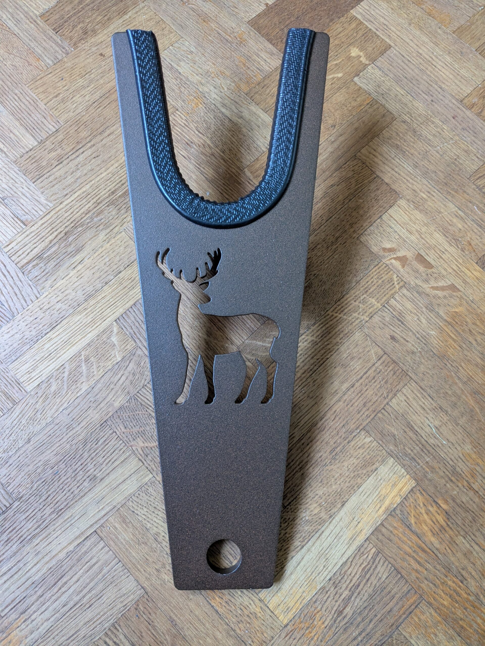 Tire-bottes en acier 8mm d’épaisseur motif tête de cheval, thermolaquage marron foncé. Longueur 34,5 cm
